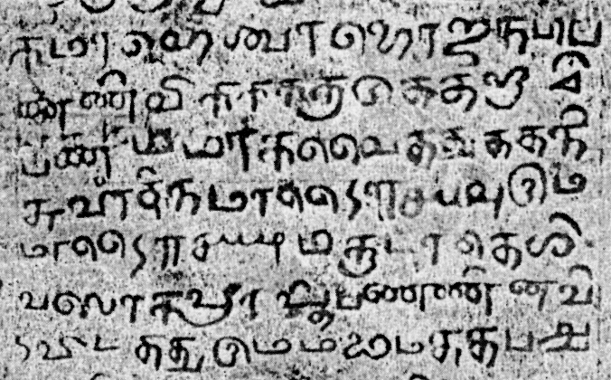 Auf der hier behandelten linken Seite (Tamil) befinden sich 32 Zeilen in einer Tamil/Grantha-Hybridschrift.