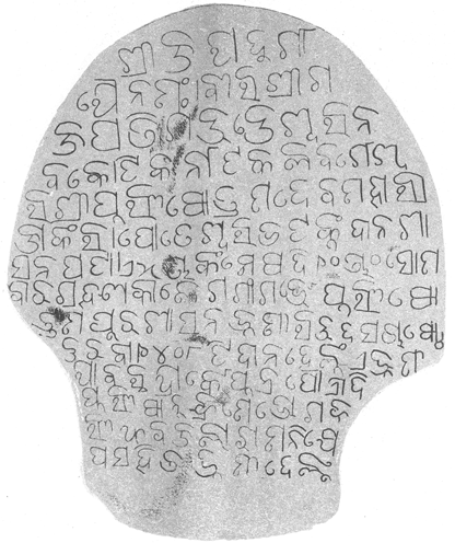 Die Transkription der Zeichen durch Beames ist z.T. willkürlich und daher unzuverlässig, die Transkription von Mukherjee hilft in vielen Fällen zur Verbesserung der Lesung. An einigen Zeichen befindet sich am linken unteren Teil ein Haken, dessen Motivation sich aus der Inschrift nicht ableiten läßt. Auch was die Schreibung des anusvāra betrifft, enthält die Inschrift einige Merkwürdigkeiten: bei den Ligaturen ṅk_ und ṅg_ wird das ṅ-Element offenbar durch einen nachgestellten anusvāra bezeichnet. Bis auf eine mögliche Ausnahme scheinen u- und ū- Vokalisierung nicht differenziert zu werden. Gleiches gilt für die Zeichen va und ba . Es werden zwei Zeichen für r-Laute verwendet, deren exakter Lautwert auf der Basis dieser Inschrift allein nicht zweifelsfrei zu klären ist. Literature